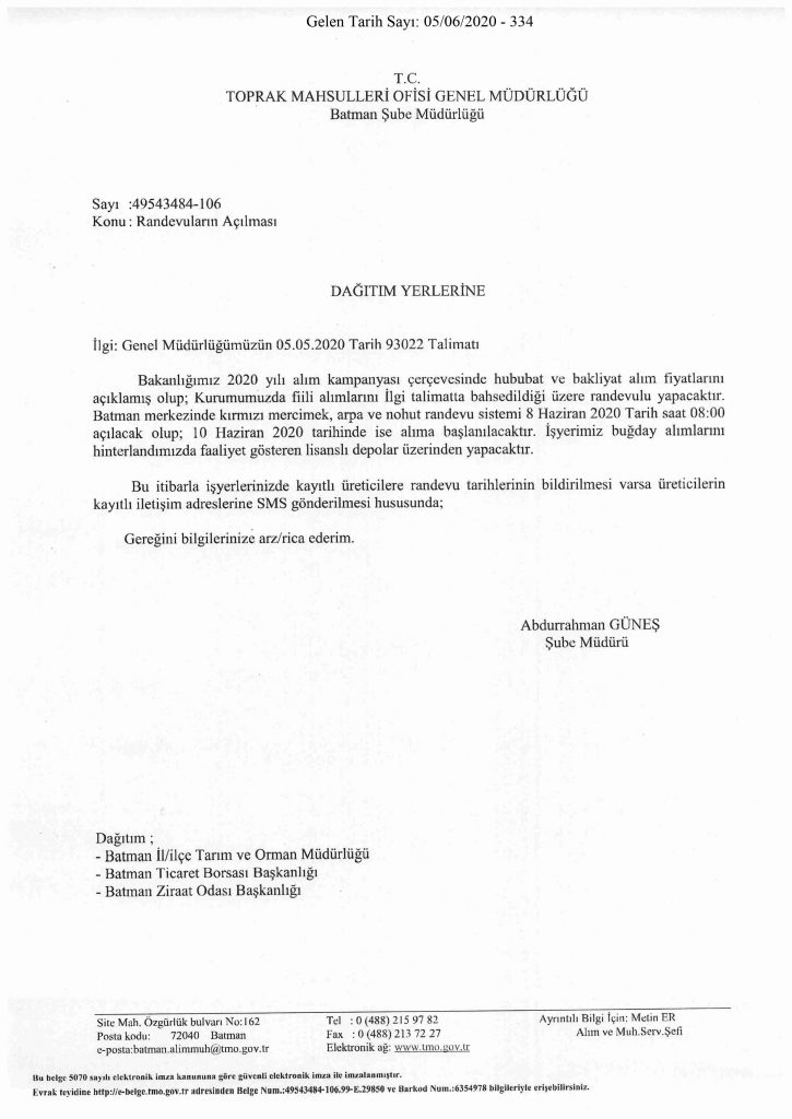 TMO Randevu Sisteminin Açılması Hk.
